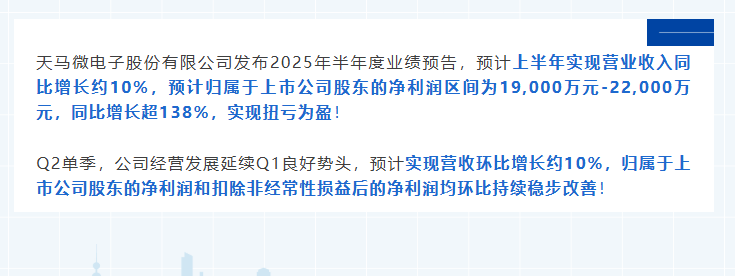 天馬微電子股份有限公司發(fā)布2025年半年度業(yè)績(jī)預(yù)告,預(yù)計(jì)上半年實(shí)現(xiàn)營(yíng)業(yè)收入同比增長(zhǎng)約10%,預(yù)計(jì)歸屬于上市公司股東的凈利潤(rùn)區(qū)間為19,000萬元-22,000萬元,同比增長(zhǎng)超138%,實(shí)現(xiàn)扭虧為盈!Q2